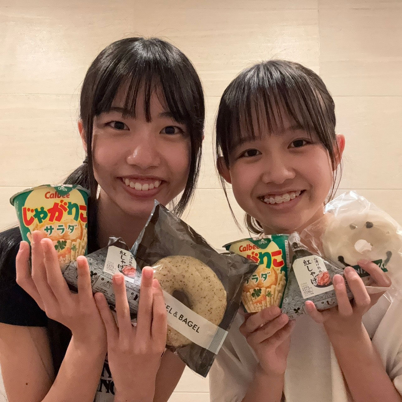 2024 年 5 月 18 日 土曜日そしてそして!!双子コーデになるゆめまの、今日は残念ながら双子コーデではありませんでしたがお昼ご飯に買っていた物が全部同じだったんです!!見た的に凄くビックリしました( ゚△°)!!じゃがりこのサラダ味(サイズも一緒!)種類は違うけどドーナツ!おにぎりの鮭味!凄くないですか!?これで洋服も同じだったら逆に怖い…笑2人でじゃがりこあげ合って仲良く食べました笑笑